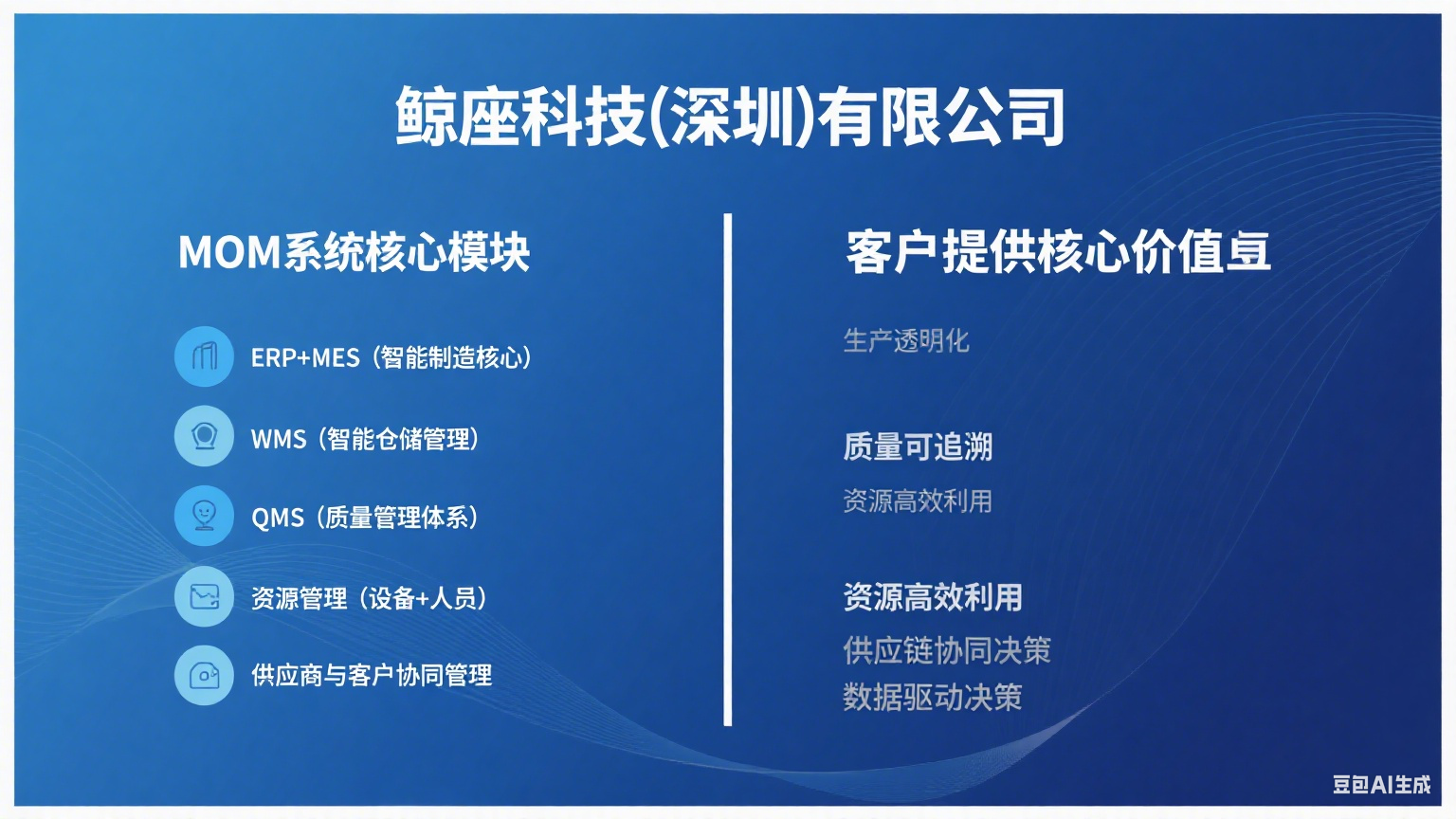 业,致力于为制造业客户提供全面的MOM(制造运营管理)系统解决方案。我们以工业4.0和智能制造为核心,通过数字化、智能化技术帮助企业 实现生产运营的高效协同与管理优化,助力企业降本增效,提升市场竞争力。
